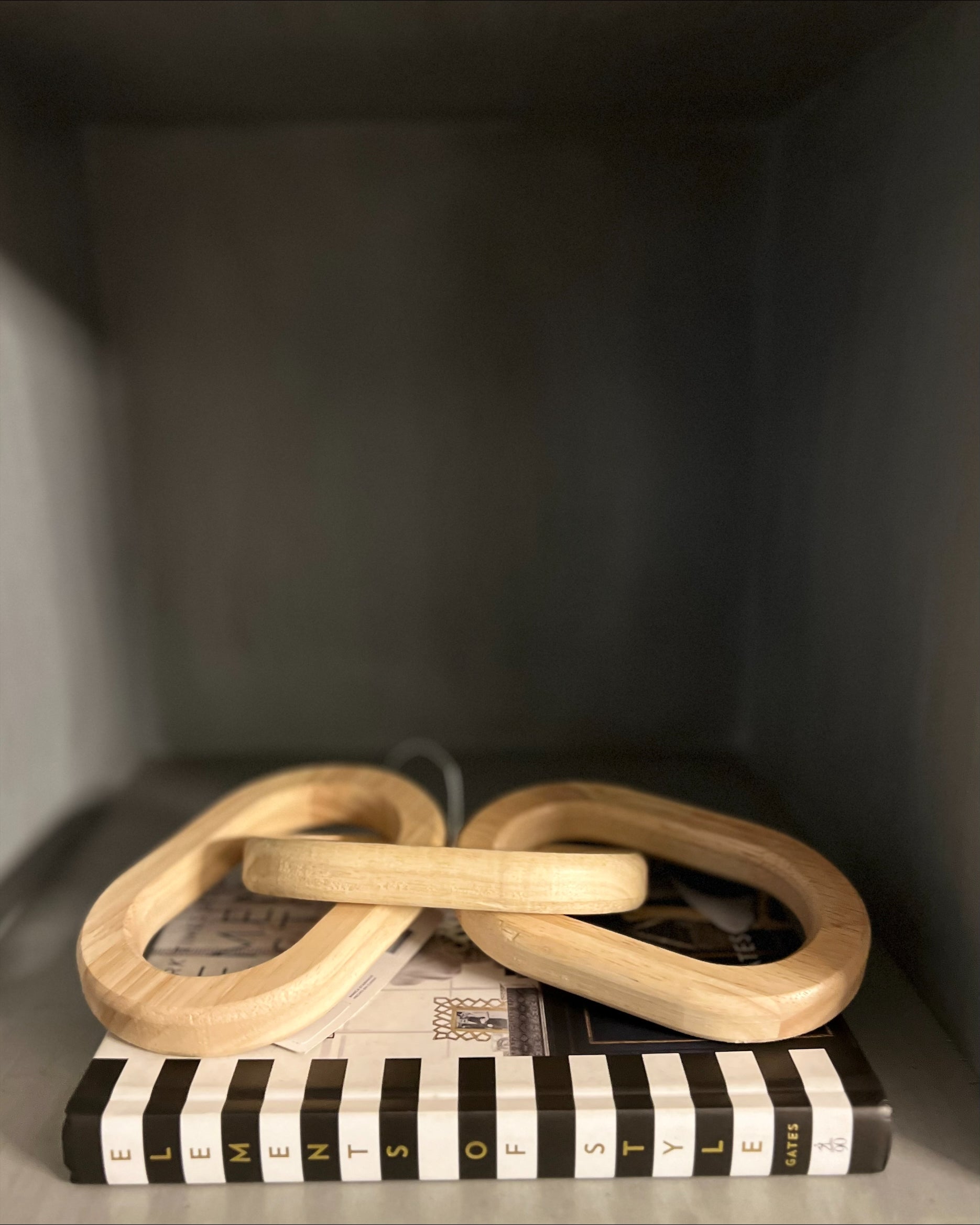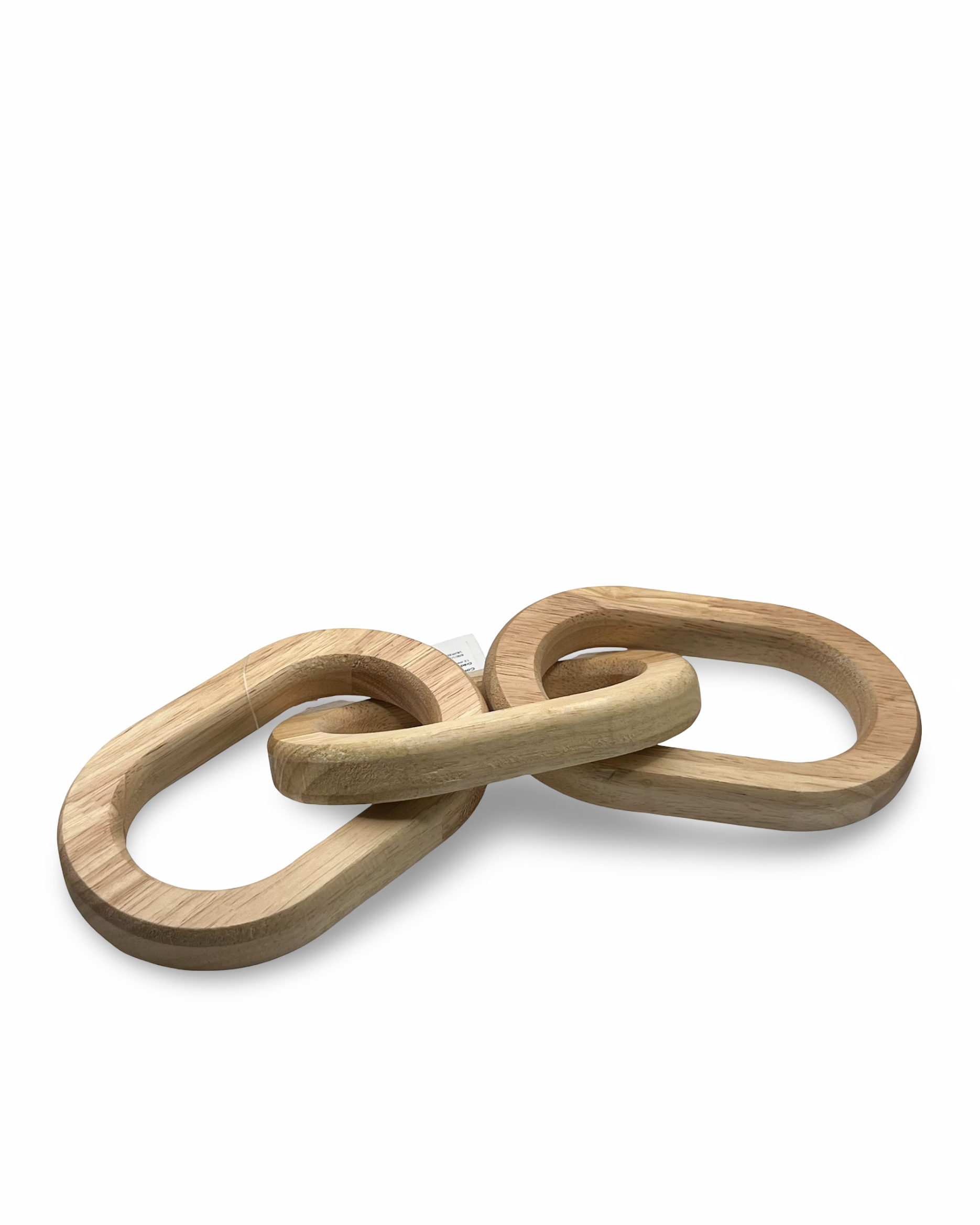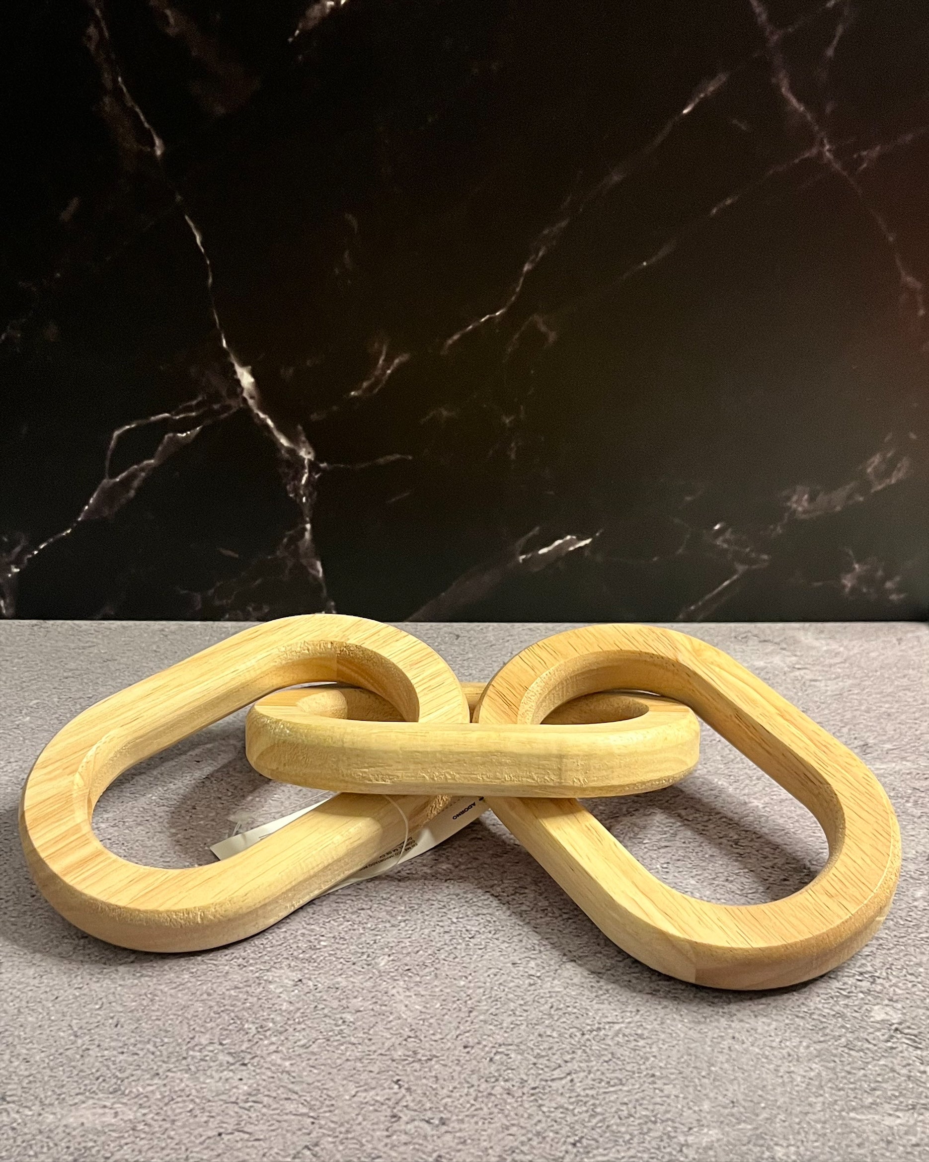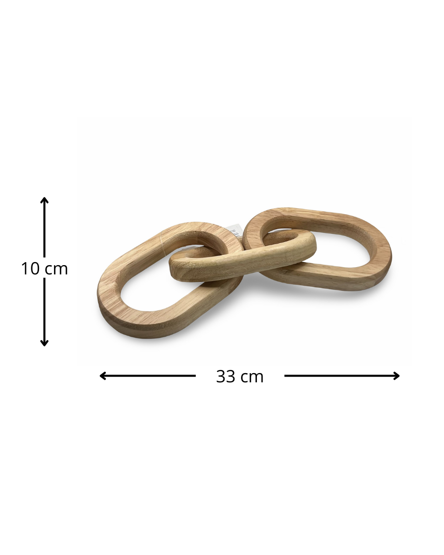 Eslabón es una cadena tallada en madera natural, compuesta por tres eslabones entrelazados que representan conexión, unión y continuidad.