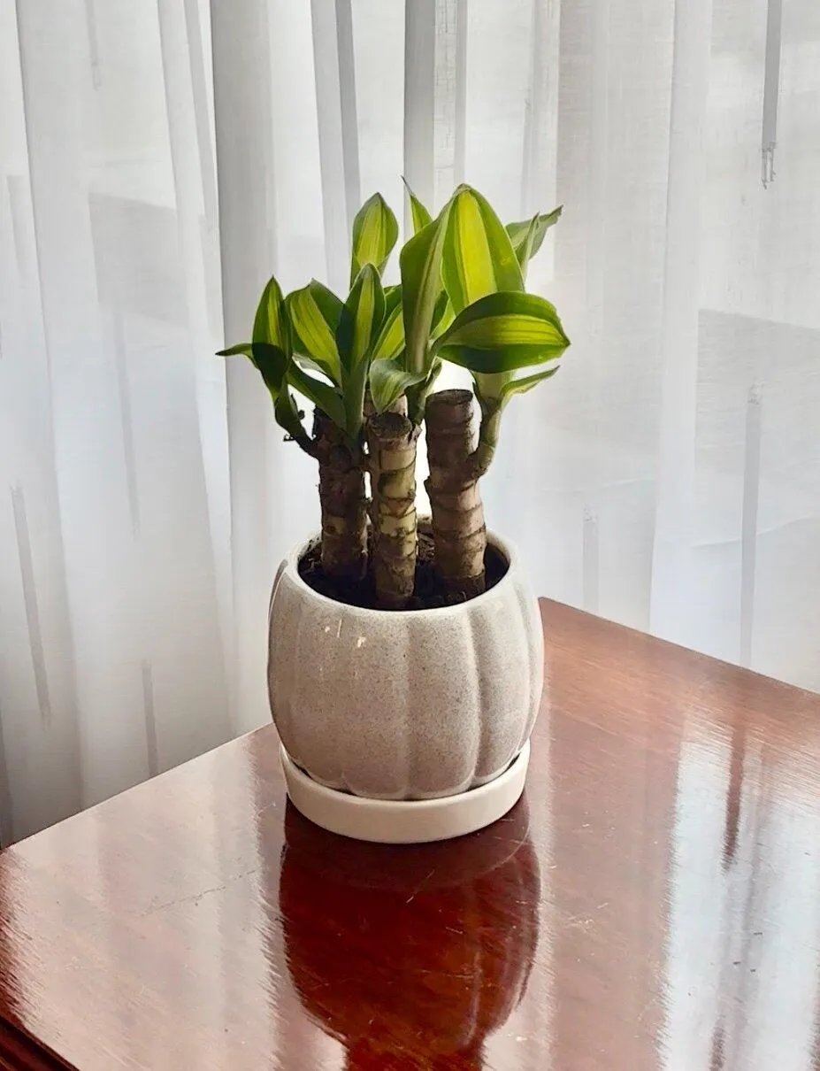 Guma es una maceta chica de cerámica hecha artesanalmente en México. Su superficie blanca jaspeada y sus delicados gajos le dan un aspecto muy decorativo.