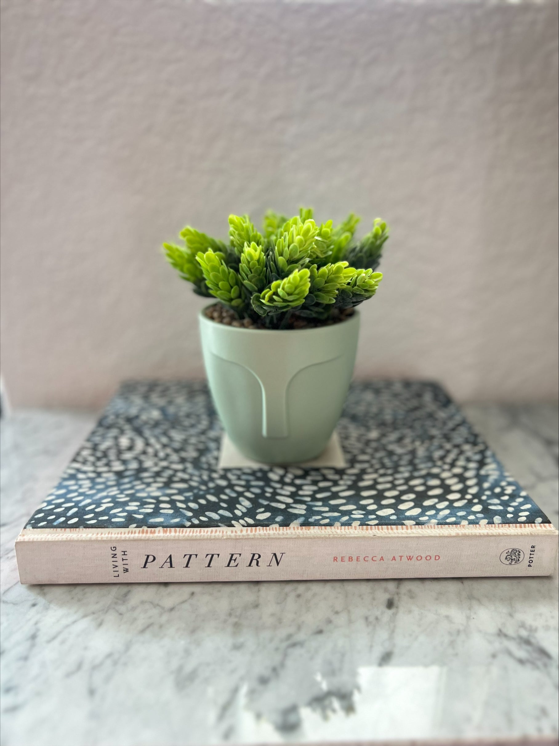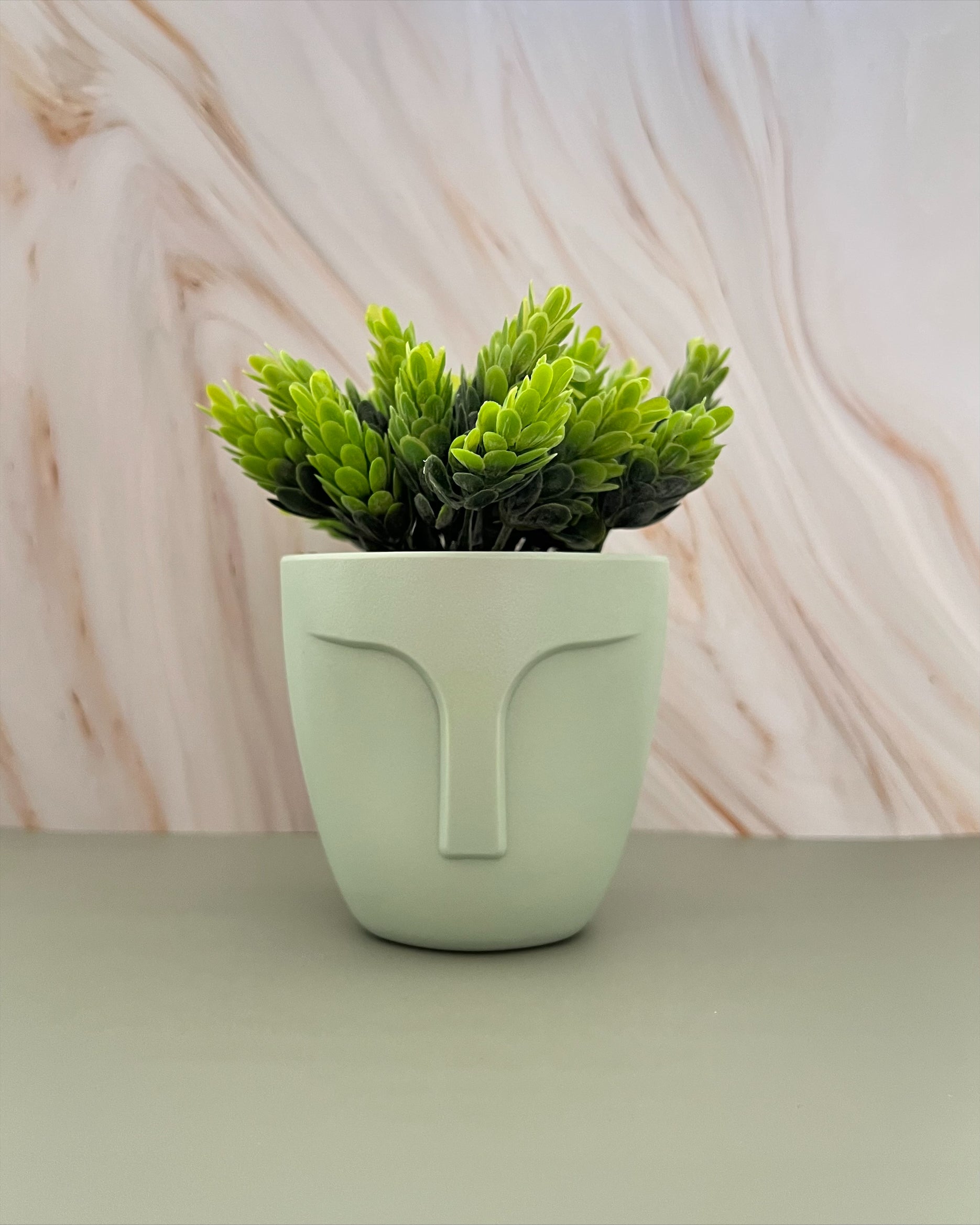 Maceta chica decorativa con relieve de rosto y planta artificial. Rostro Verde aporta un toque de modernidad a cualquier espacio.